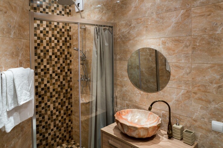 В собственной ванной комнате: бесплатные туалетно-косметические принадлежности, халат, туалет, душ, полотенца, коврик для ног, тапочки, фен, туалетная бумага.