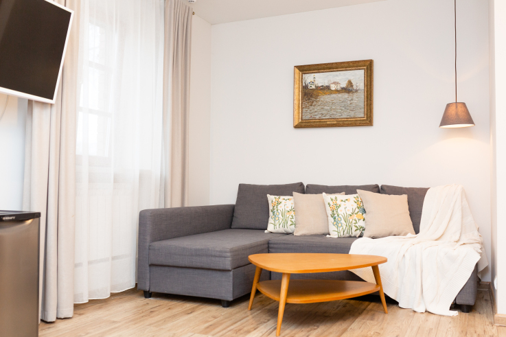 Звукоизолированный семейный номер с большой двухспальной кроватью и раскладным двухспальным диваном.